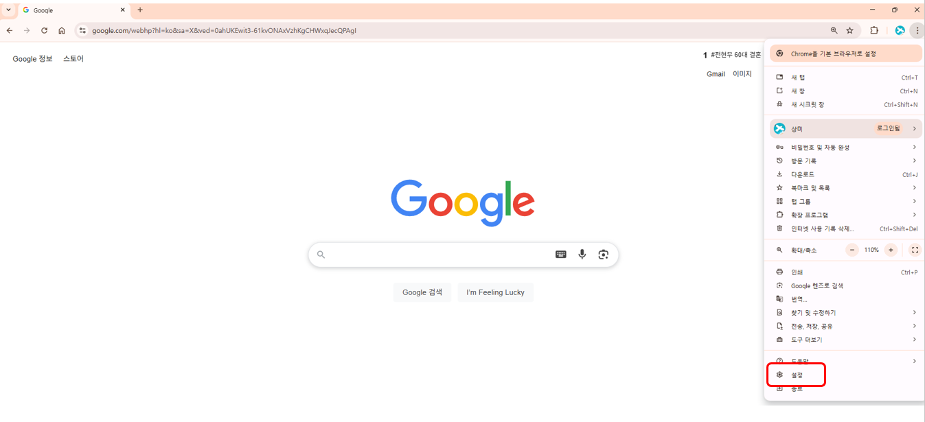 보통 설정은 크롬 우측 상단의 점 세 개를 클릭하면 나옵니다.