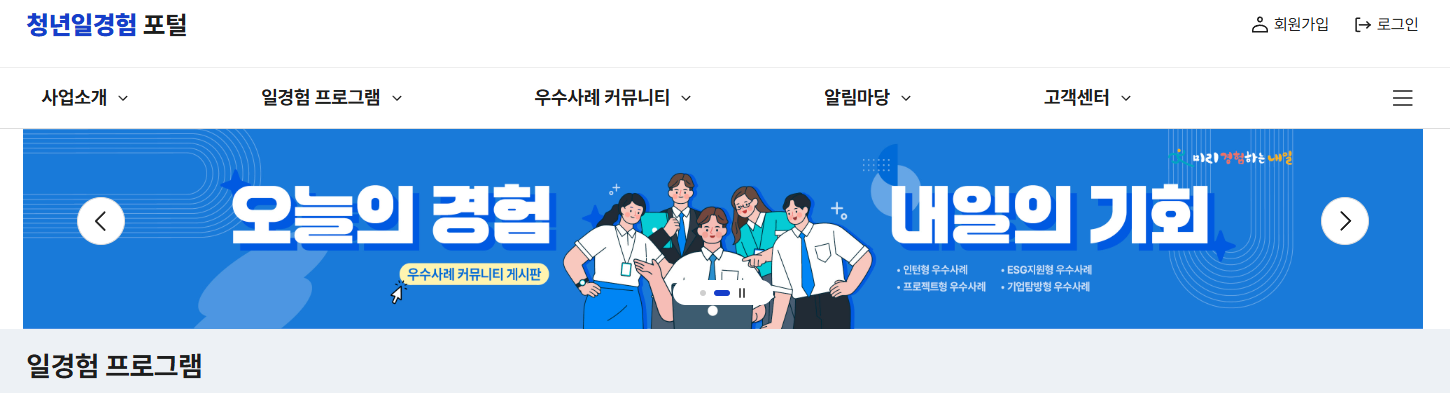 - 포털 접속: 청년‧기업 일경험포털 [https://yw.work24.go.kr]에 접속하여 회원가입을 합니다.