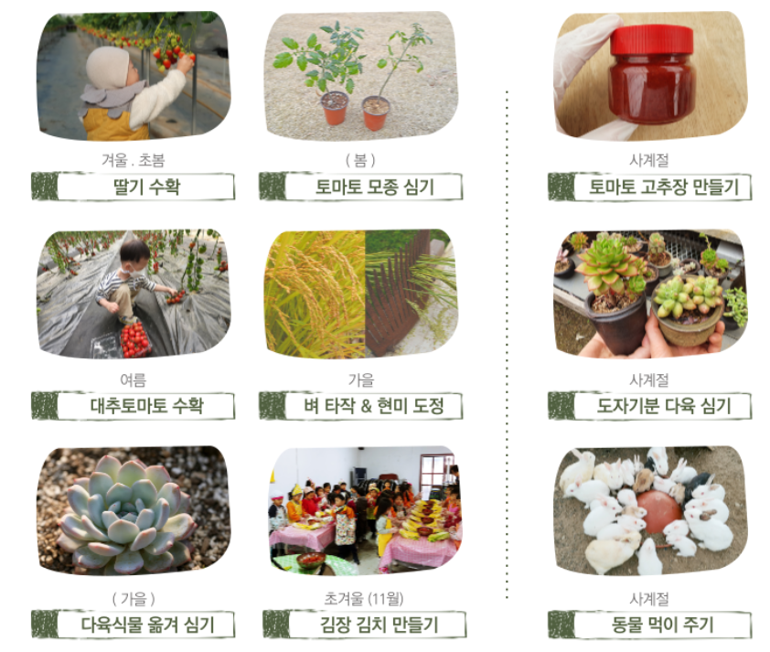 | 체험 프로그램 | 농작물 수확, 동물 체험, 레일썰매 등 |