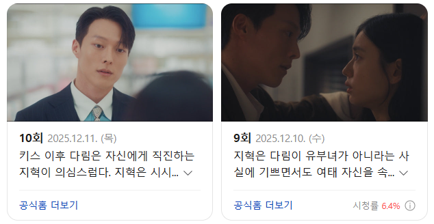 공지혁은 고다림이 유부녀라는 사실을 알지만, 이미 그녀에게 빠져버린 자신의 마음 때문에 괴로워하며 속앓이를 합니다. 고 다림은 자신의 비밀을 들키지 않기 위해 필사적으로 노력하는 과정에서 공지혁과 얽히고설키며 아슬아슬한 오피스 로맨스를 펼치게 됩니다. 최근 회차(9회)에서는 공지혁이 고 다림이 사실 유부녀도, 애 엄마도 아니라는 모든 비밀을 알게 되었고, 긴 고민 끝에 직진 로맨스를 결심하며 짜릿한 벽치기 키스 엔딩을 선보여 시청자들을 열광시켰습니다.