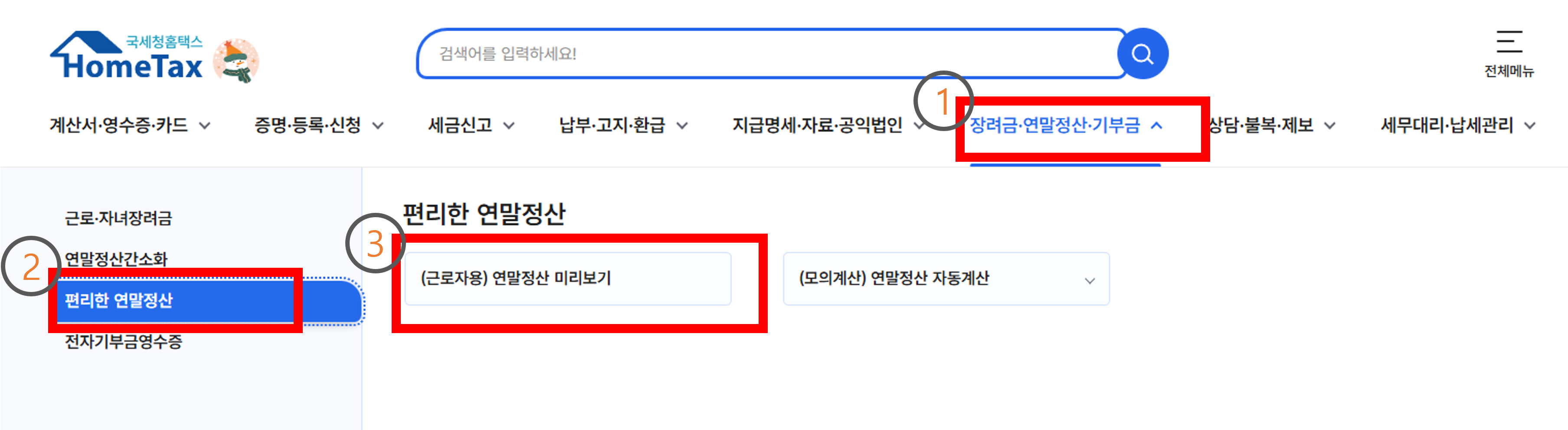 - 메뉴 선택: 홈택스 메인 화면에서 '연말정산 미리보기 서비스' 메뉴를 선택합니다.